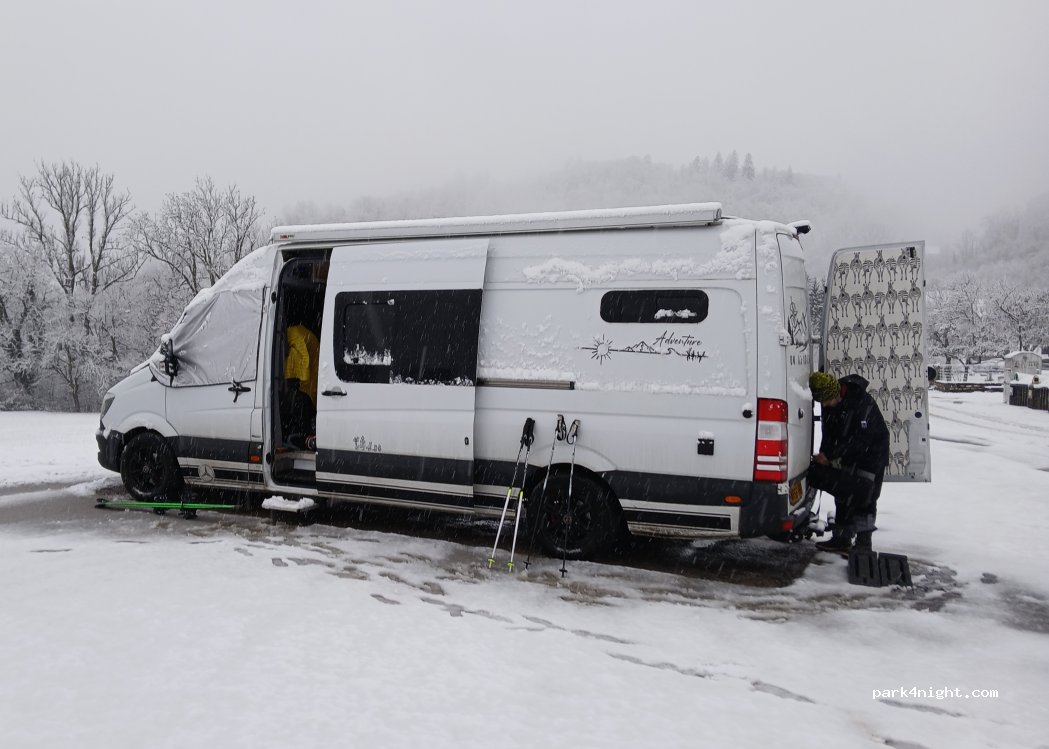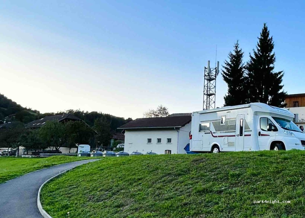 super overnight stay at this car park with great views, next to the Salle des Fetes. we used this car park as its where the Navette (bus) takes you up to Praz de Lys Sommand €1.60. There is a good Boulangerie, mini supermarket, Pharmacy, Tabac, Fresh local produce store and a selection of restaurants in the village.