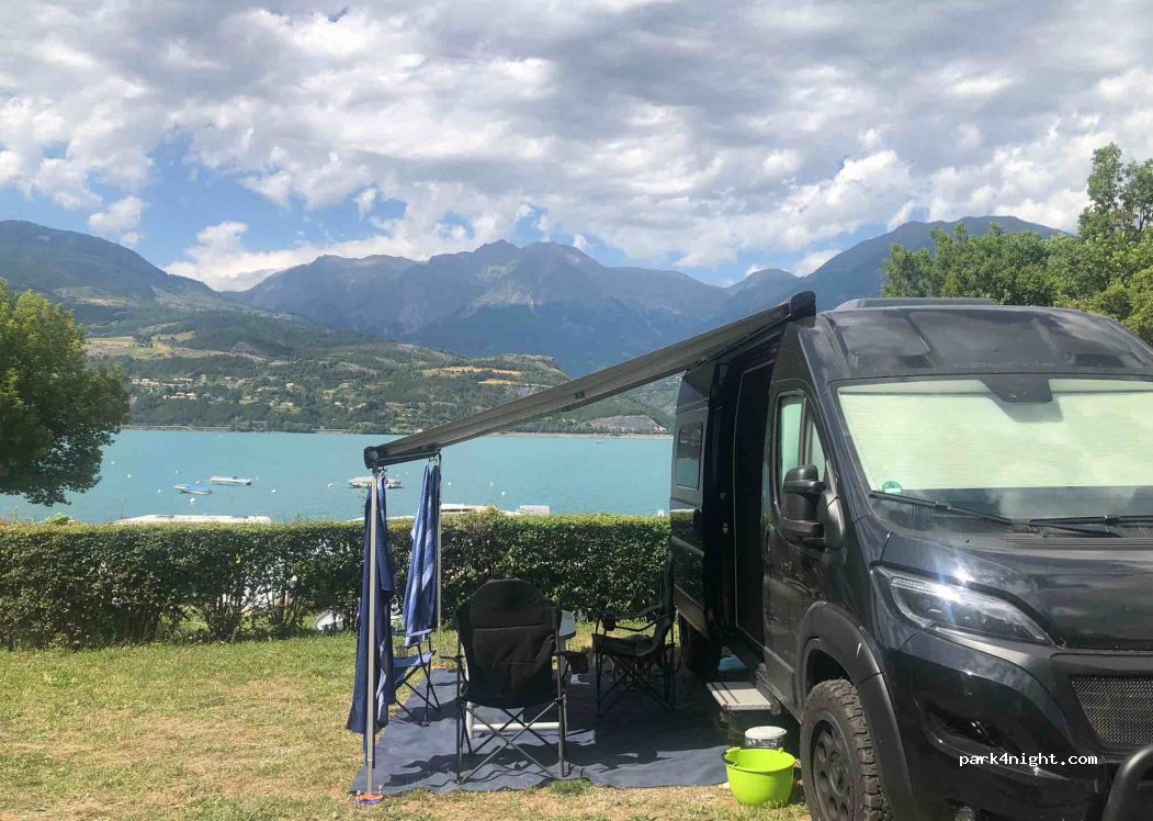 Point de vue au top au bord du lac de Serre-Ponçon. Très calme. Prix en septembre : 19,80€ la nuit.