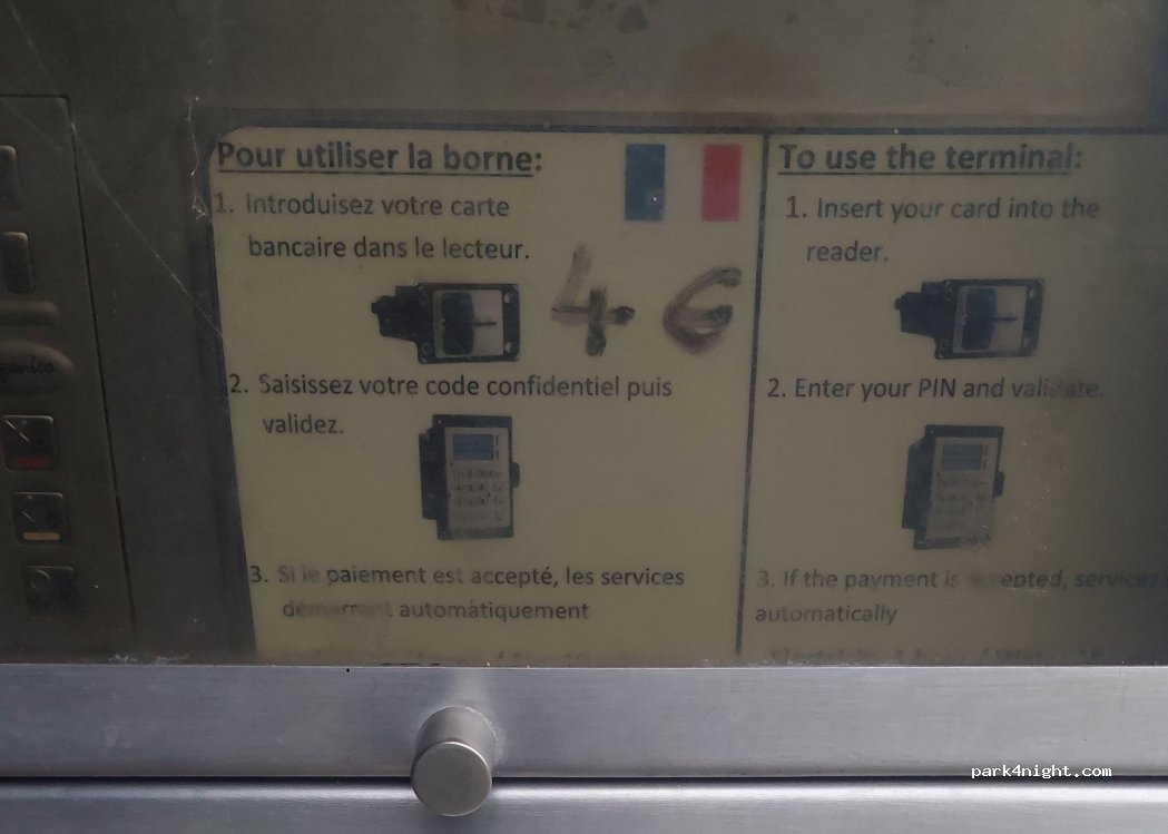 Pratique pour vidange/eau/électricité. 2€. Trop proche de la route pour nous pour y dormir mais belle étendue d herbe derrière et tables de pique nique. Pour ceux que le bruit des voitures ne gênent pas, c est sympa.