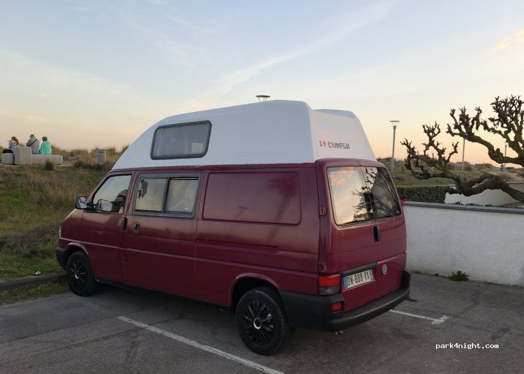 Dans une impasse, au calme. Il n'y a que 6 places de parking. Juste en bord de plage et d'une promenade. Nous y avons passé une super nuit après un bain de minuit. Attention, il n'y a plus de douche, mais juste un rince pieds de 9h à 21h. Je recommande ce coin