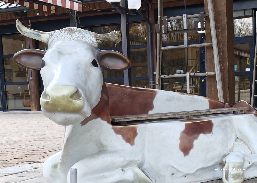 der schmucklos asphaltierte Platz liegt links vom Restaurant an einem Wäldchen. Auf der rechten Seite allerdings liegt die Käsefabrik, eine große Industrieanlage mit lauten Maschinen und ständigem LKW-Verkehr.