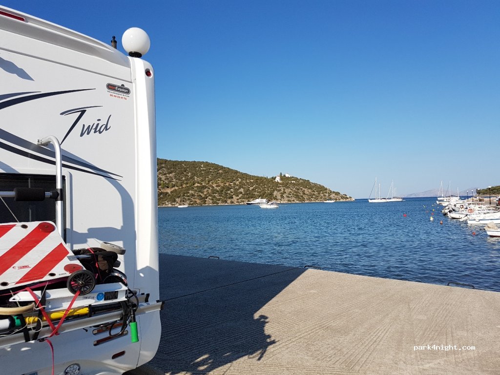 We could not park on arrival as the market is here on Thursdays, so we just went to the small parking area (day only) at the end of the peninsula. Parked at this park up late afternoon when the market finished. Close to the port, tavernas, and shops and to catch the hydrofoil to Hydra, just a 25 minutes journey each way. The only negative was how badly the mules are treated on Hydra.