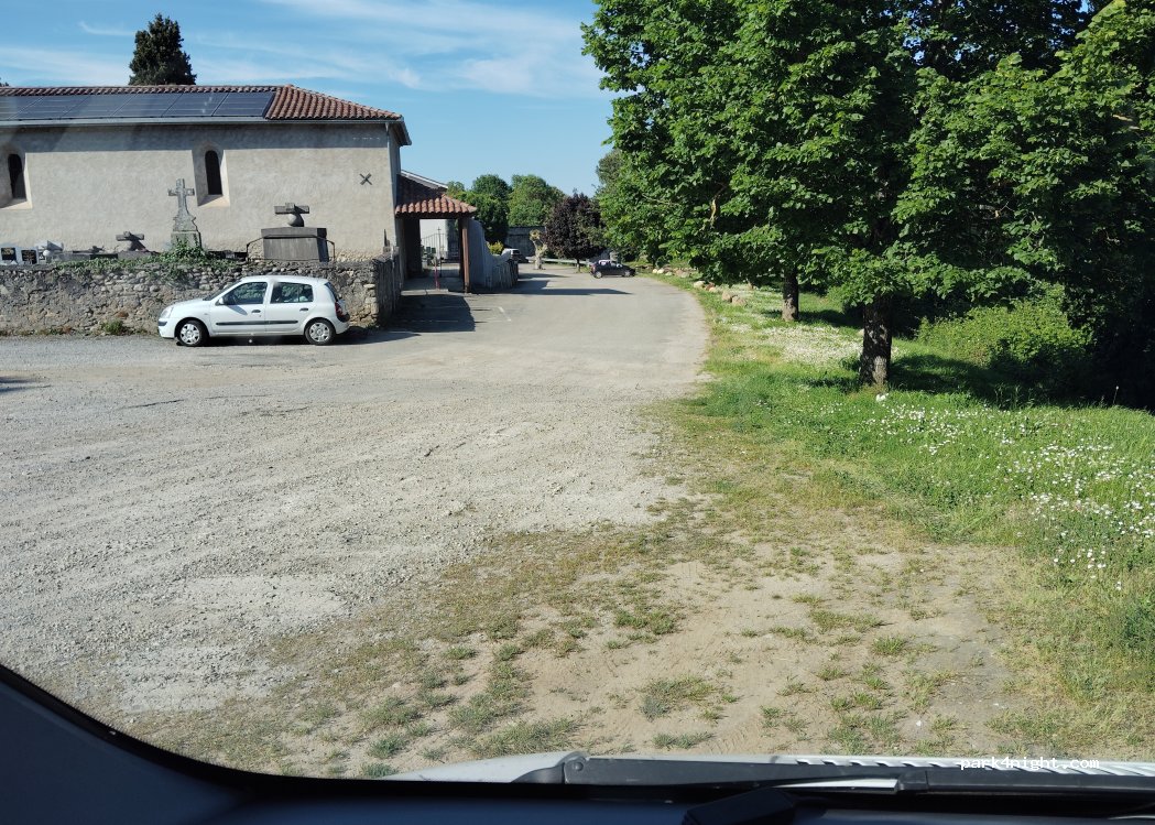 Parking un peu caillouteux au bord de la rivière, à côté du cimetière.