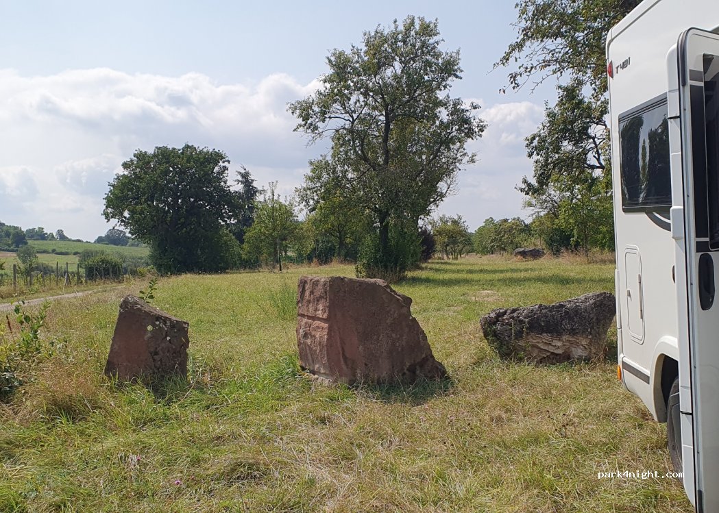 nous y avons passé 2 nuits un peu de musique de fond mais ct le wk , par contre n'hésitez pas à faire qq mètres de plus sur la route goudronnée vous trouverez 1 endroit idyllique sous les pommiers ,plat, au début du parcours de découverte des chortens la ville de Bouxwiller est à découvrir.....