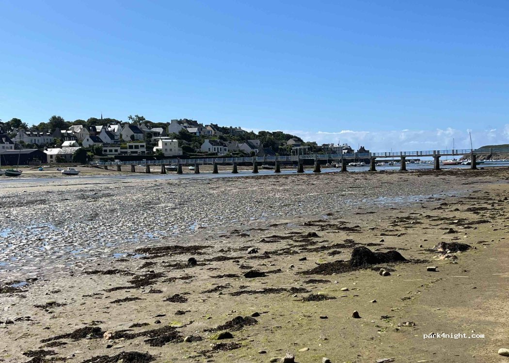 nous avons passé une nuit dans ce parking qui se vide de voitures en fin de journée. habitation pas loin mais aucun problème avec les riverains. passerelle pratique pour faire un tour au conquet