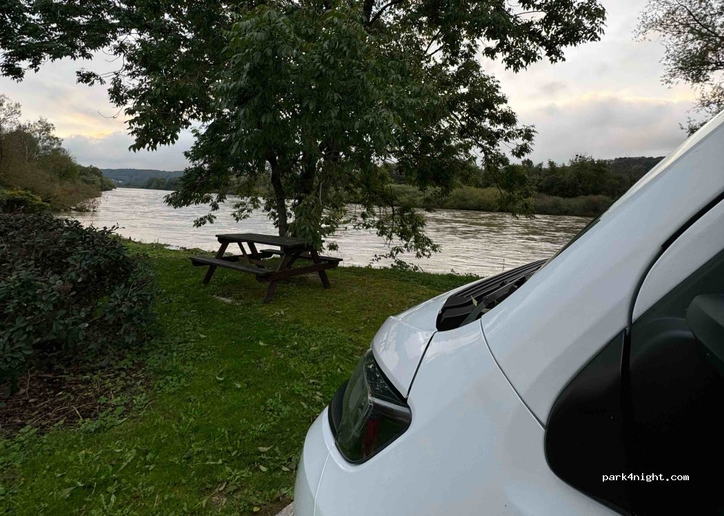 Très bon emplacement malgré le bruit de la route. L'aire est propre est bien équipée table et poubelles. Jolie vue sur la rivière, réseau 4G ok. Merci à la commune.