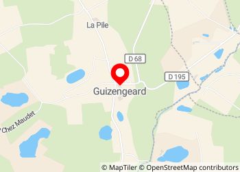 Parking de la salle des fêtes, à côté de la mairie, légèrement en pente. Point d'eau derrière la mairie et tables de pique-nique sous les arbres. A environ 1,5 km du site des anciennes carrières d'argile de Guizengeard.
