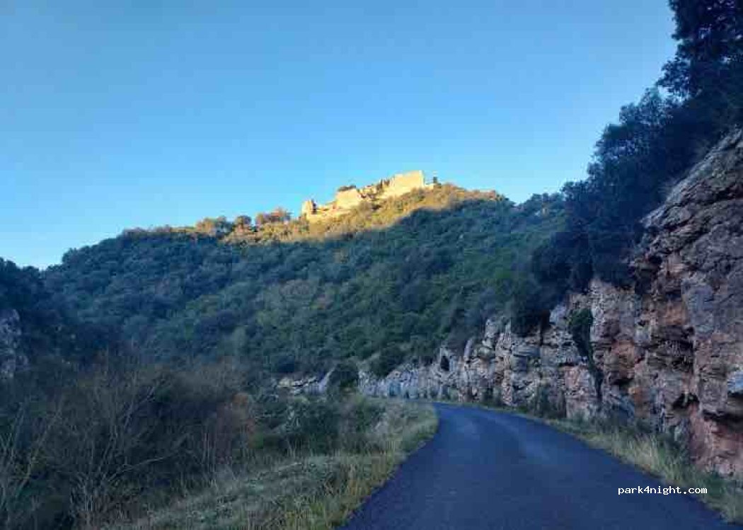 Aparcamiento tranquilo cerca del pueblo de Termes y del Castillo Cátaro de Termes. Para entrar es un pequeño descenso con algunas ramas colgando, pero llegaréis bien. En el pueblo, a 2 minutos a pie.