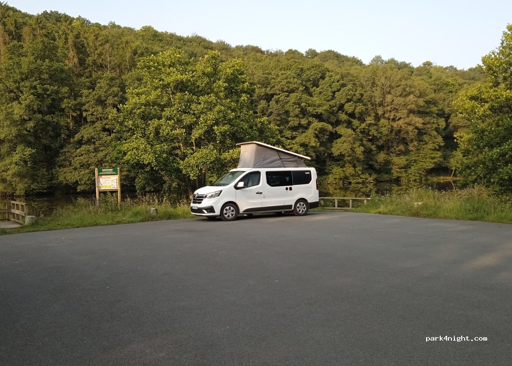 Extremely quiet night with great views. Flat to park, fine for campera 7m+ we were the only van. Nice walk around the lake (2.5km ish)we ran in the AM 10.2km through nice trails and forest. Highly recommend. We had a school kayaking / team building group arrive at 8am, with nice teachers that welcomed us, but a fisherman told us we couldn't park. No signs to say we couldn't. Thankyou Callac.