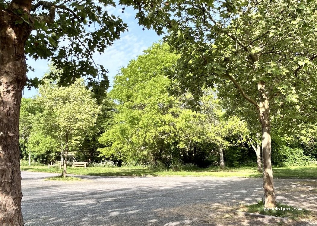 Stationnement sous les chênes, très calme et paisible et très proche de l'autoroute, ce qui est pratique mais par contre on l'entend bien en bruit de fond.