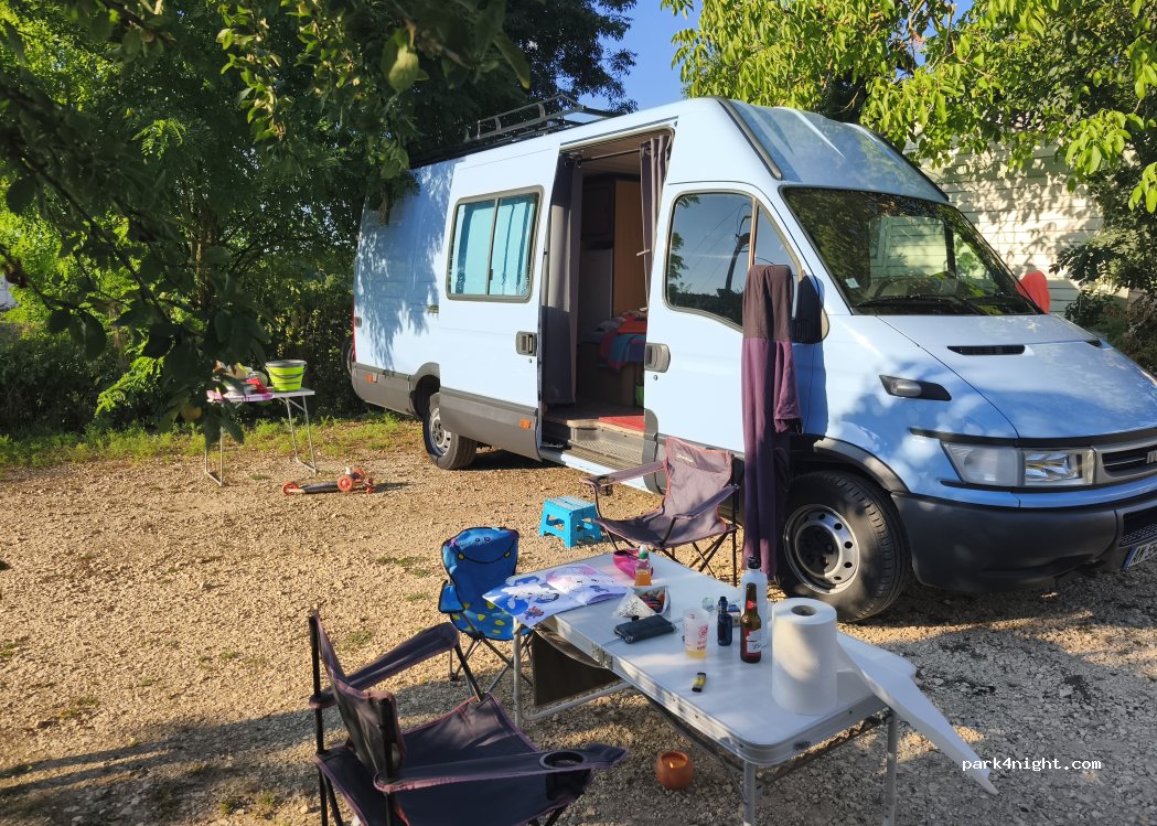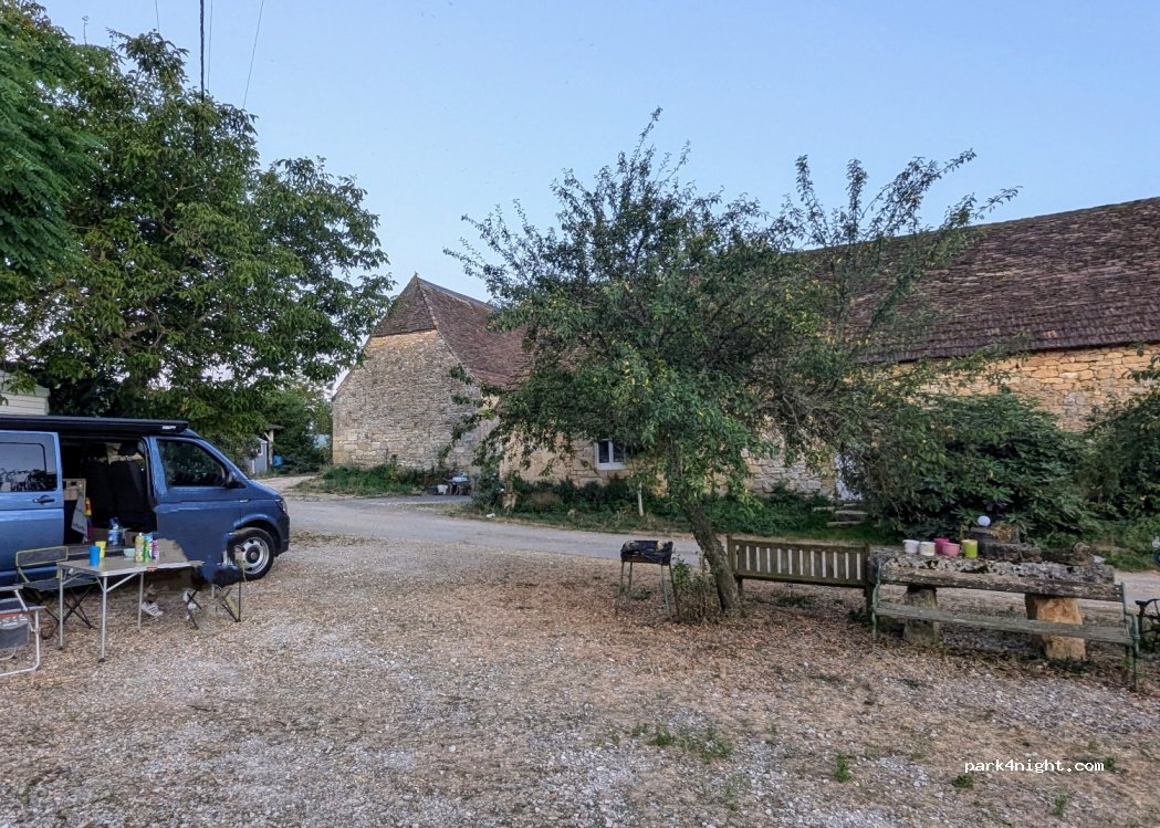 Heerlijk gastvrije plek op het erf van een kleinschalige boerderij bovenop een heuvel. Zonder aankondiging werden wij met onze 7 meter lange camper vriendelijk ontvangen door de vrolijke gastvrouw en heer Cecile en Christophe en hun lieve honden. Er is een eindeloze lijst zelfgemaakte producten die erg goed smaken. Het toilet (gratis) en de douche (2 euro) zijn perfect schoon.