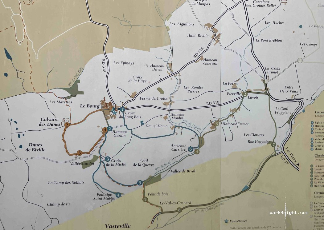 3 camping-cars pour la nuit. Une carte sur le parking de la Mairie avec des randonnées. Celle du Calvaire est très belle, vue sur la côte. Nous avons quitté ce parking pour celui de la Mairie le temps de notre balade.