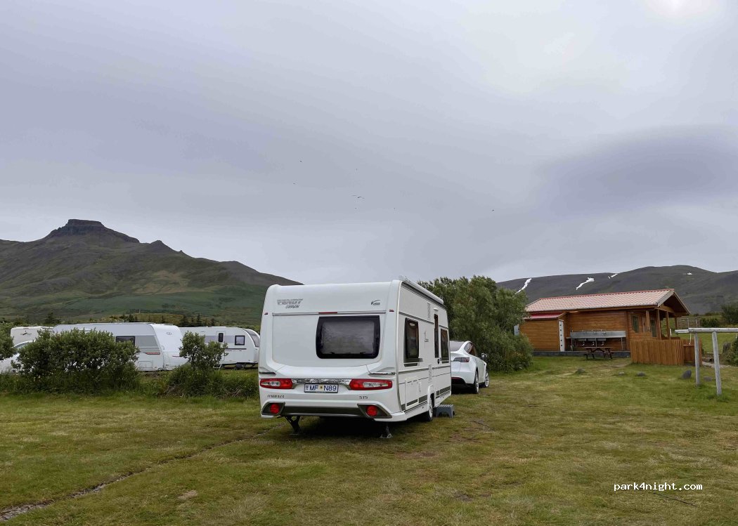 Accepts the CampingCard. Sheltered location with lots of greenery, hedges and trees around the site. Kitchen and toilets in the log cabin, shower (400 ISK for 8 minutes) in the annex behind it. Quite busy at the weekend. Disposal available, but not accessible by van; filling up fresh water is easier. Good mobile phone reception.