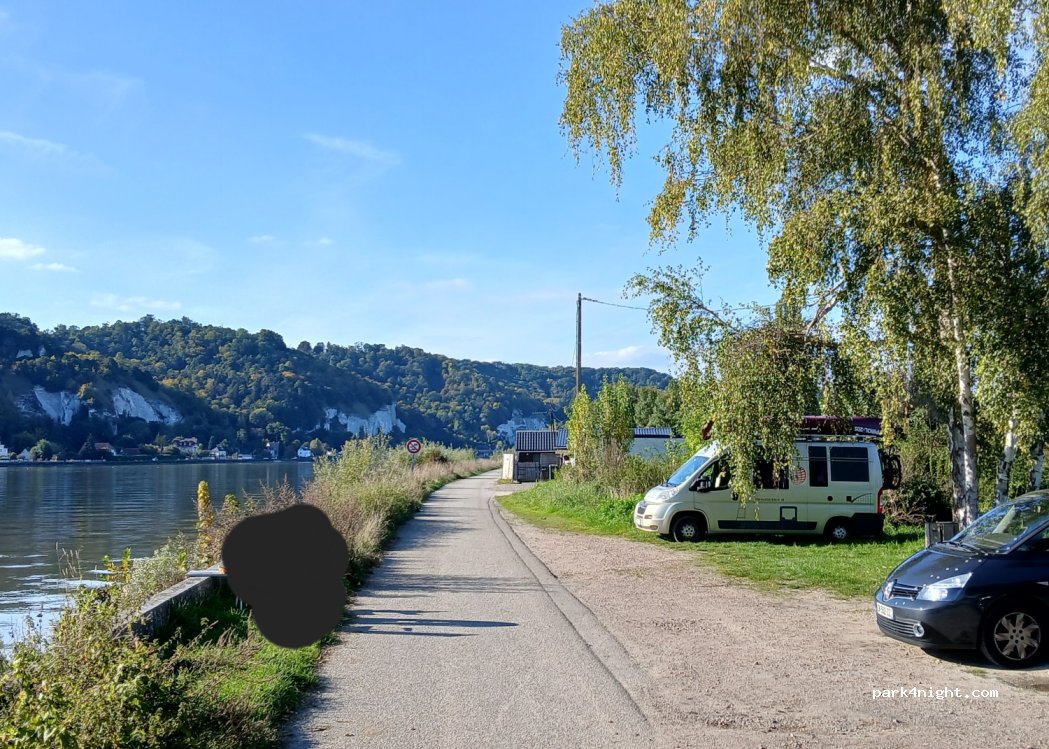 Endroit paisible, Face au beau village de La Bouille et en bord de seine. Proche du bac gratuit qui tourne en continu de 7h à 22h pour faire la traversée. A la bouille : Bonne boulangerie, restaurants, galerie d'art... Avons vu, après coup, sur un commentaire d'un autre lieu qu'il était interdit de s'y stationner mais nous n'avons vu aucun panneau.