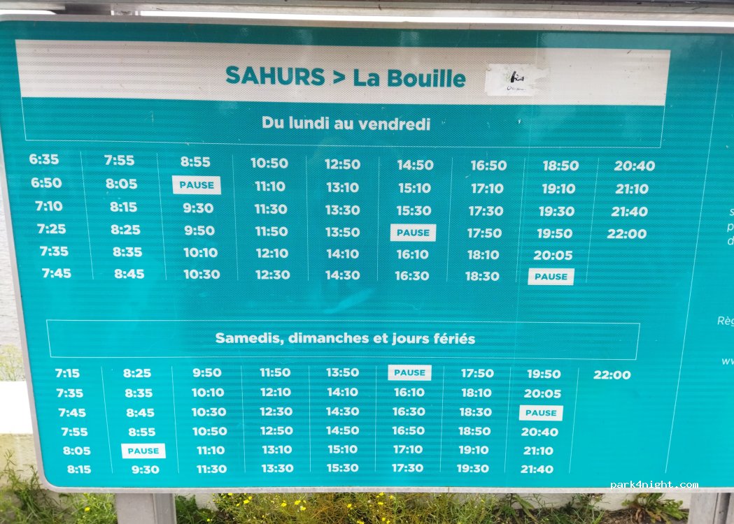 Parking sur herbe et gravier, sous les arbres, proche de l'embarcadère du bac permettant la traversée vers Bouille. En plus on profite d'une jolie vue sur ce village. Traversée très fréquente du bac et jusqu'assez tard dans la journée permettant la visite tranquille de ce joli petit bourg. Nuit tranquille.