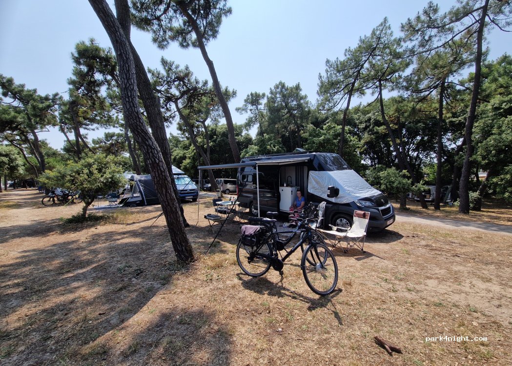 23,90€ la nuit pour un van de 2 personnes, camping bien équipé en sanitaire et activités diverses (dépôt de pain, food truck, location de vélos, jeux pour enfants...). Sanitaires très propres et modernes. Emplacements assez grands mais pas très bien délimités! Beau cadre au milieu des pins avec certains emplacements vue mer. Accès plage privée à l’intérieur du camping qui arrive sur la magnifique plage des dames. Petit centre ville très proche en voiture avec commerces et restaurants. En revanche le réseau 4G passe mal et le wifi du camping ne fonctionnait pas.