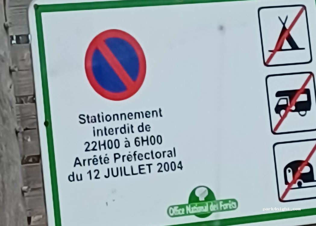 Arrivé a 22 h en debut septembre il est noté parking nuit interdi , nous nous sommes garés au debut du parking afin de ne pas gener. Pas de soucis . Belle balade et sentier à proximité.merci pour ce lieu