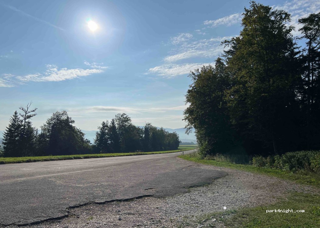 Platz am Straßenrand, Picknicktische in der Nähe, ein wenig Verkehr vor allem am Sonntag, aber nicht schlecht. Es hat einen Abfalleimer, der aber nicht als Deponie benutzt werden sollte. Der Parkplatz ist uneben