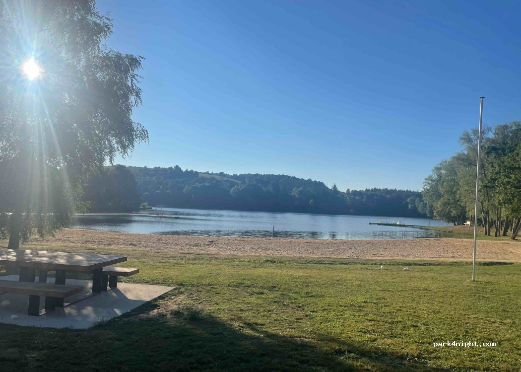 Parking de l étang de Miel, endroit très calme et ombragé, avec vue sur l étang. Chemin de ballade tout autour avec parcours sportif et jeux pour enfants. Activités nautiques non encore ouvertes lors de notre passage.