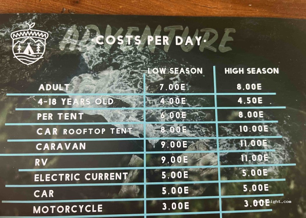 Hab heute gefragt was 1 Nacht kostet (normales Auto mit Dachzelt vor Saison) Sie meinte zusammen 14€, ich fragte nach da ich ja nur den Platz für mein Auto brauche. Sie meinte das wäre wie im Auto schlafen und deshalb mehr. Da ich jetzt noch nie mehr als 8-10€ zahlen sollte bin ich weiter gefahren.