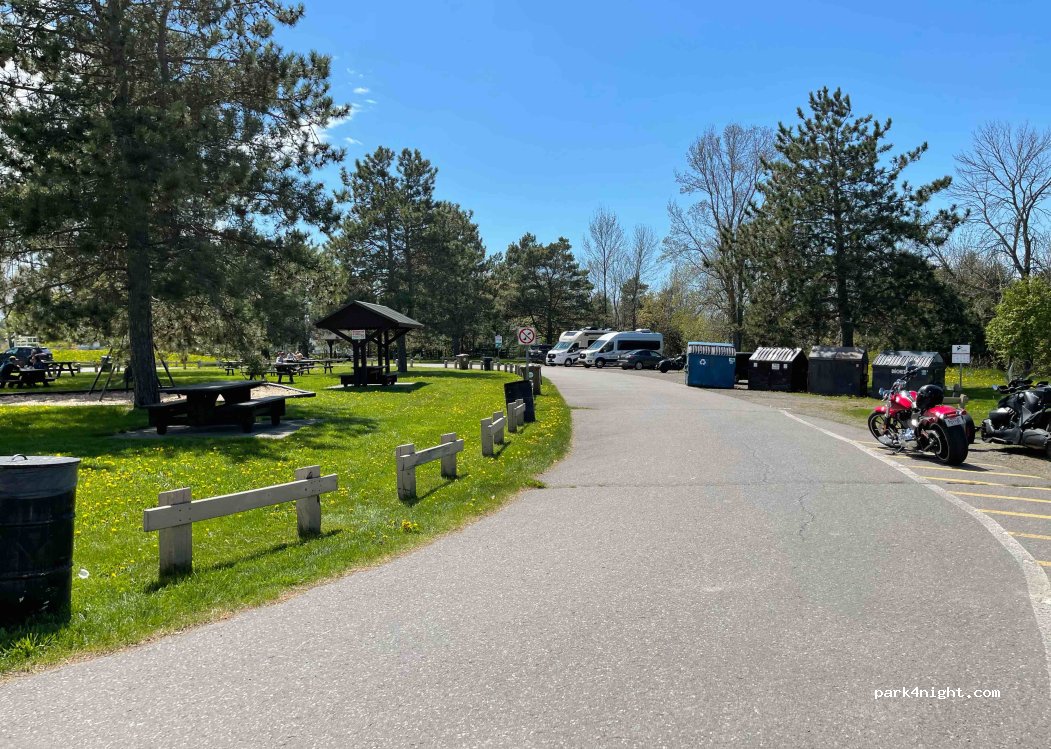 Bel endroit pour passer la nuit si le bruit des voitures sur l'autoroute ne vous incommode pas. Il y a des toilettes avec table à langer, un parc pour enfants, un sentier avec observatoire et vie sur le fleuve, des poubelles, des bacs de recyclage et de compost.