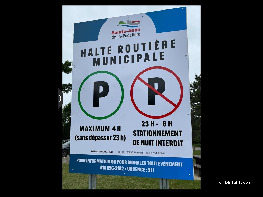 Halte municipale, avec nuitée autorisée ! Air de jeux fréquenté jusqu’à 20h. Ainsi qu’un petit kiosque qui vend des poutines pour les plus gourmands !! Toilettes propres et en bonnes état :-)