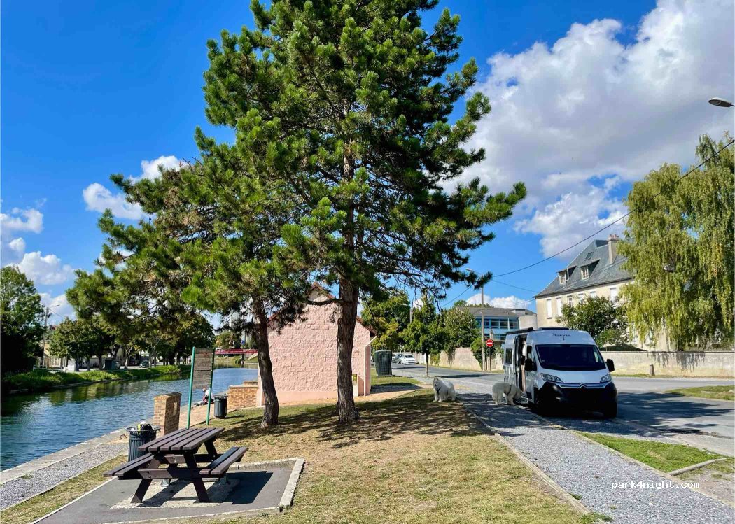 Halte super agréable pour un déjeuner au bord de l'eau. Possibilité de se balader en ville et au bord de l'Aisne sans avoir trop de chemin à faire. A proximité d'une route passante toutefois, je ne sais pas ce que ça peut donner pour la nuit....