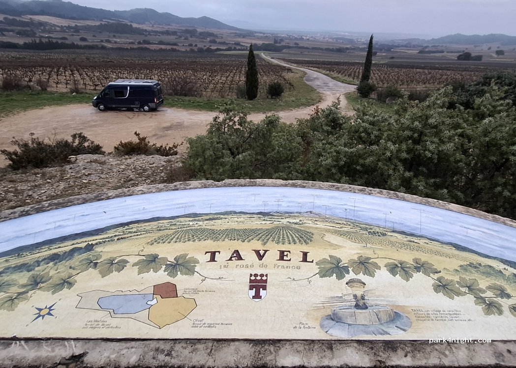 Parking plat dans les vignes, au pied de la table d’orientation sans aucun service - vue sur le Ventoux par temps clair - nous n’y avons fait qu’une pause déjeuner mais la nuit doit y être sereine car loin de tout - il y a même une place à l’ombre pour un petit véhicule