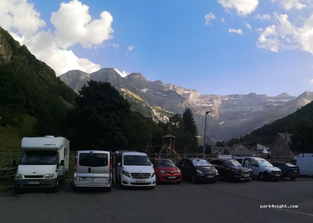 Parking idéalement situé au départ de la rando pour le cirque de Gavarnie. 8€ les 24h. Nous y avons passé la nuit, aucun panneau d'interdiction pour les campings car. Au calme, au bord du Gave, aire de jeux juste à côté avec tables de pique nique, et une vue imprenable sur le Cirque de Gavarnie.