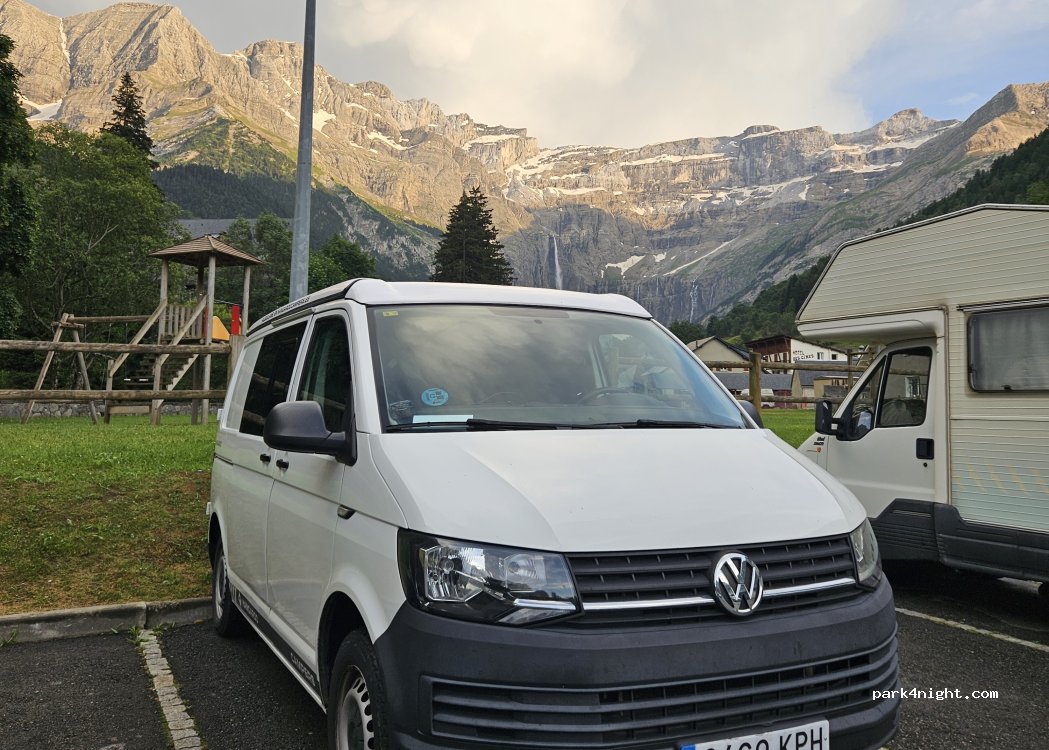 Hemos dormido una noche en este parking, cuesta 7€ / 24 horas, es un parking para coches pero se puede dormir tranquilamente, parque infantil al lado, ideal para ir al circo de gavarnie andando!
