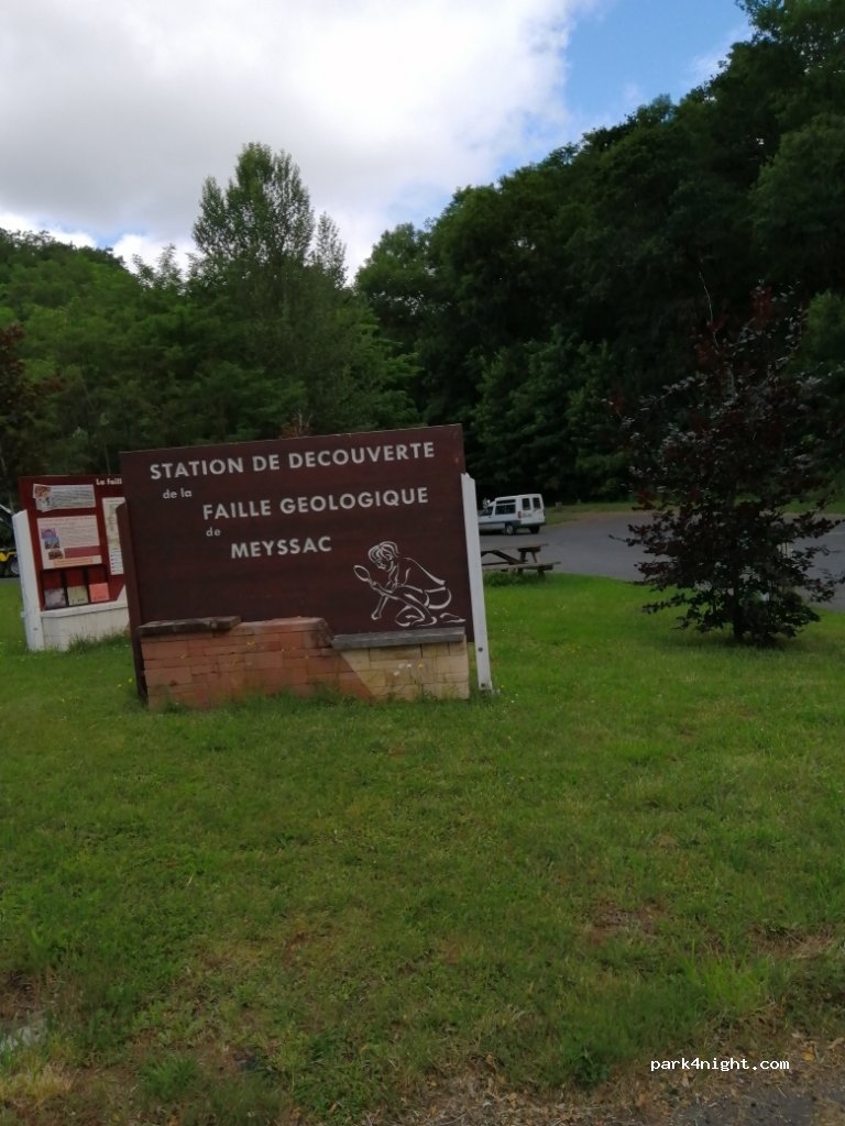 Parking on the old turn of the road and partly turnaround area for coaches. It is the 1st station of the Meysac geological fault circuit. 10 minutes walk from the entrance to the village of Collonges, along the road often behind the security barriers and through the place called Le Lac. 15 minutes from the main street of the village. Tarred parking. Some picnic tables and a trash can.