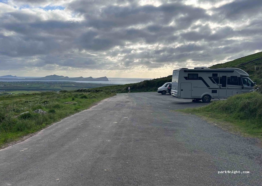 Cosán hat Naomh, Parkplatz in den Bergen, am Anfang eines Wanderweges, nachts sehr ruhig und windgeschützt genug und schöner Aussichtspunkt. Dies ist der Ausgangspunkt für die Besteigung des Mount Brandon und kann tagsüber mit Wanderern beschäftigt sein. Stellenweise schmale Zufahrtsstraße.