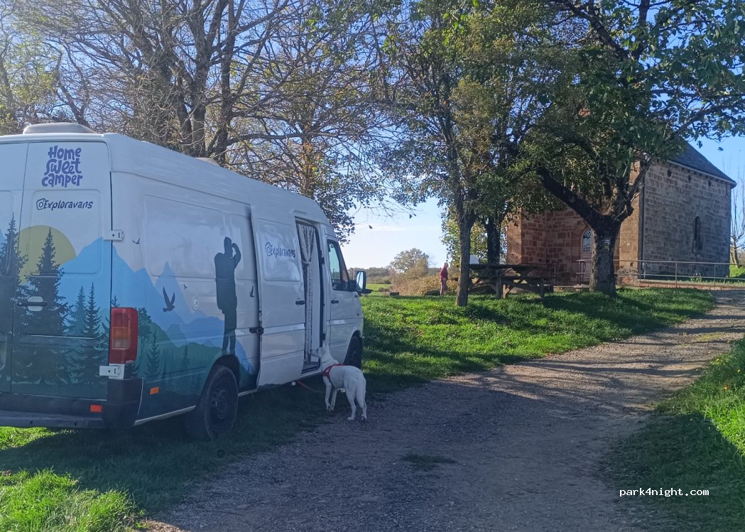 Spot super pour une nuit. Jolie petite chapelle avec de beaux vitraux. Au bord du chemin de compostelle vous verrez défiler les pèlerins au petit matin. Toilettes très propres.