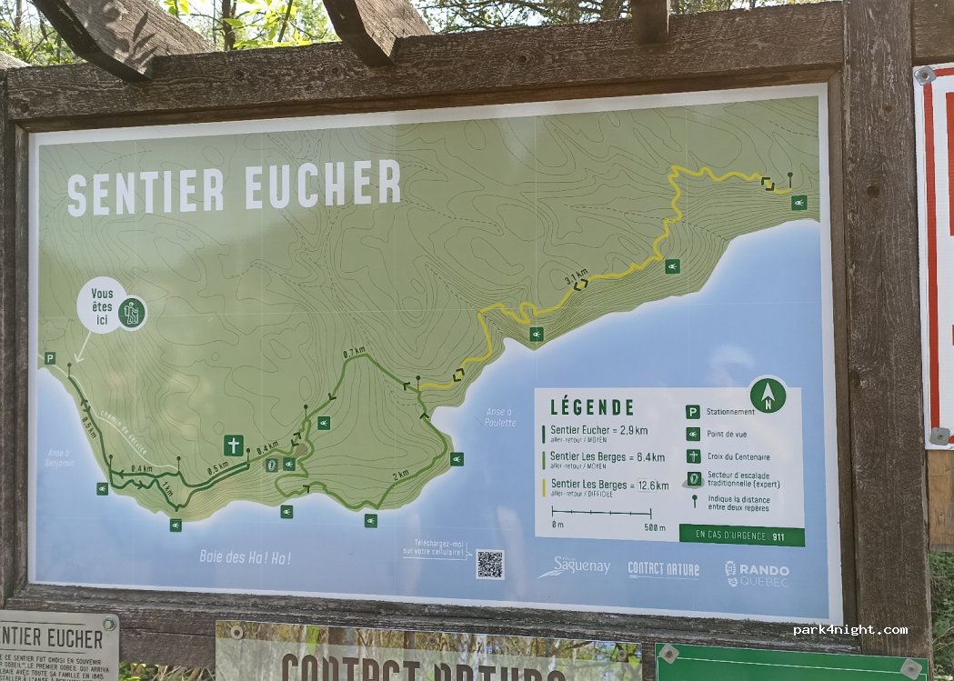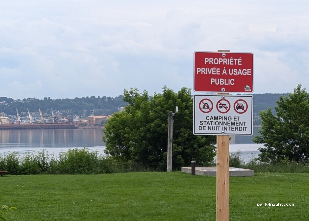 Parking de la Marina juste avant le sentier Eucher. Table de pique-nique, toilettes chimiques et eau potable. superbe vue sur la baie, au calme.