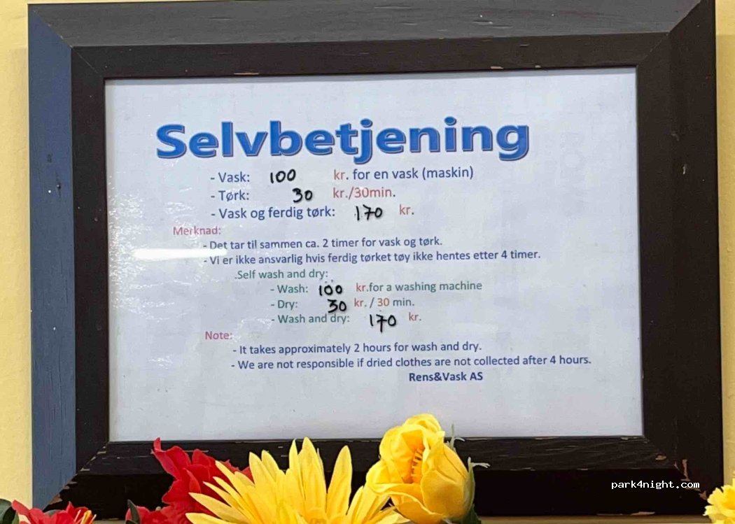 Lavage à 40 degrés de notre linge + séchage en 1h pour 140 nok (nous avons utilisé notre propre dosette de lavage mais la personne en propose aussi je pense avec un coût supplémentaire), nous avons pu payer en carte. La personne présente était très gentille.