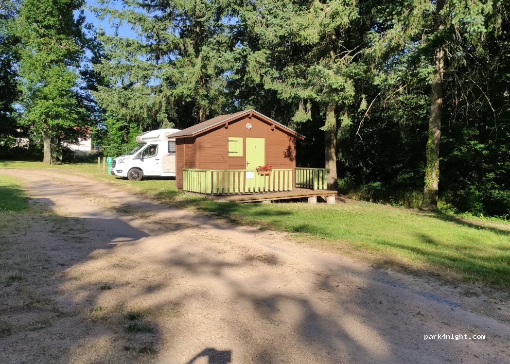 Cheap Aire €12 in the winter, can fill water and empty toilet and includes electric hook up. No toilets in winter. Nice walks in the woods from the campsite.