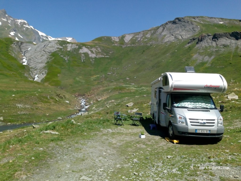 Super spot au calme, juste assez éloigné de la route du col pour ne pas entendre les voitures. Bien rester sur le renfoncement plat, le chemin est utilisé par les agriculteurs du coin. Nuit au son du torrent et des marmottes. Le chemin est caillouteux mais sans problème en camping car par temps sec.
