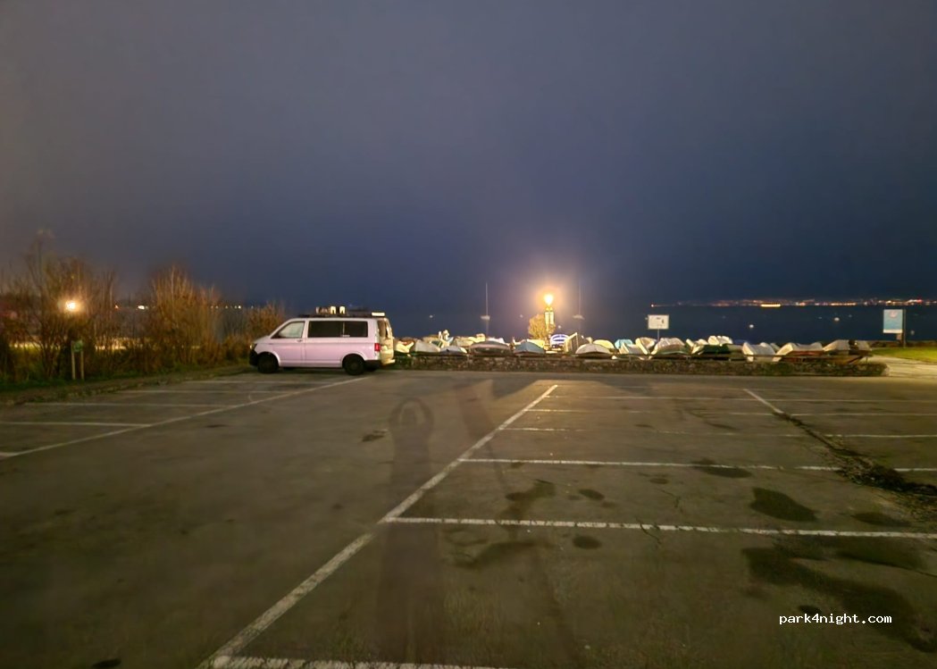 Small and slightly tight car park overlooking the lake. Toilets on site that are open all night. We parked here for 1 night when visiting the tulip festival, was a 5min cycle away. Paid via app.