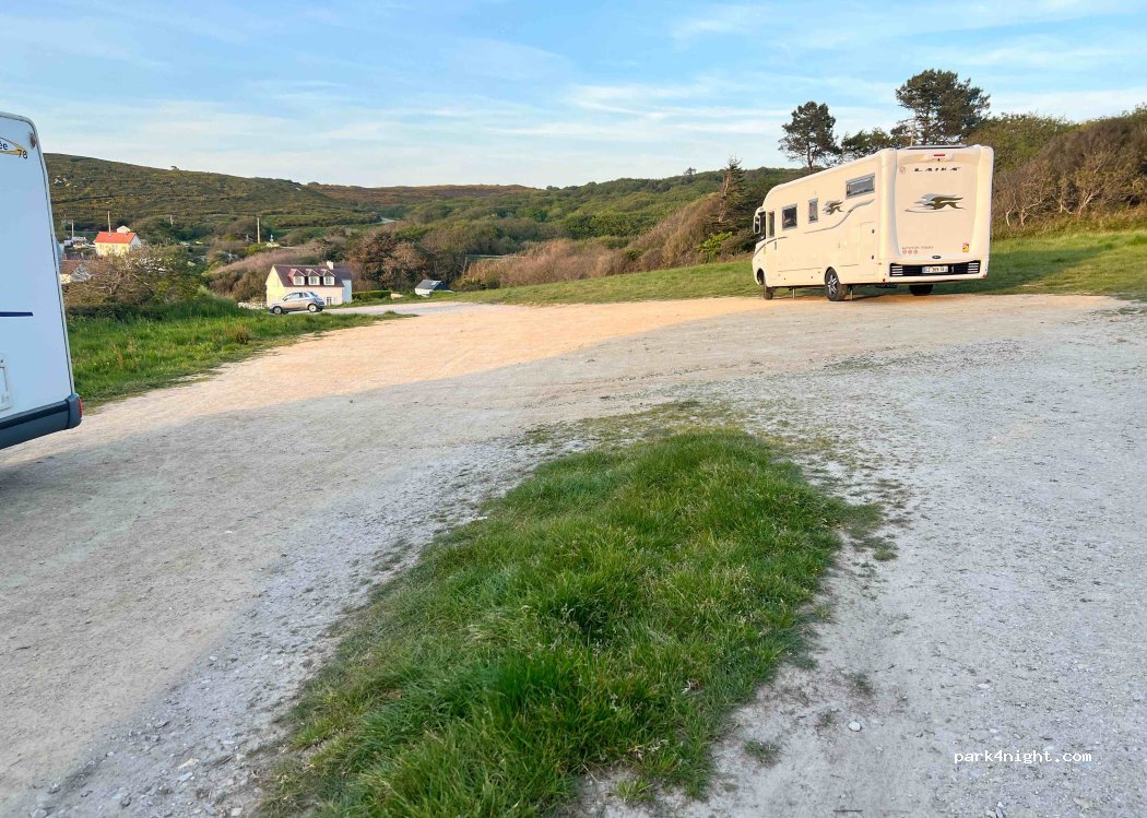 Accès en pente , en fourgon ça passe ! Les cailloux ne nous ont pas dérangé et l’herbe est cramé en ce moment ! Aucune commodité mais une belle vue mer sur l’anse du brick . Du bruit en soirée mais nuit plutôt calme ...pas de camping on sort rien.