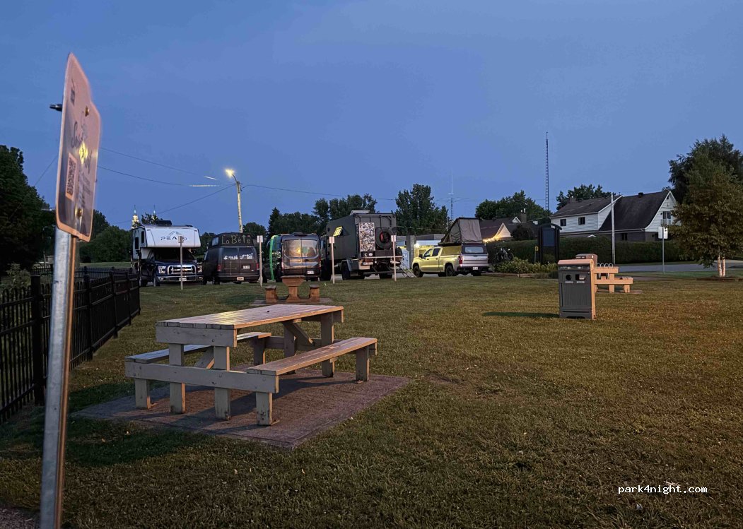 Longueur maximum 23 pieds. Le stationnement pour véhicule plus long est situé près du centre de loisirs. Svp respectez les indications inscrites sur le panneau d’information et n’oubliez pas de faire des achats dans la ville pour remercier cette municipalité de nous offrir deux endroits pour un arrêt-dodo.