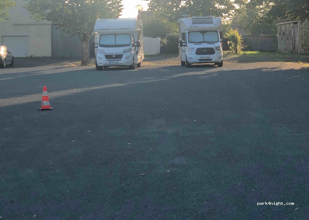 un grand parking, avec une bonne boulangerie à côté, des toilettes et un point d'eau pour remplir un bidon. nuit au calme