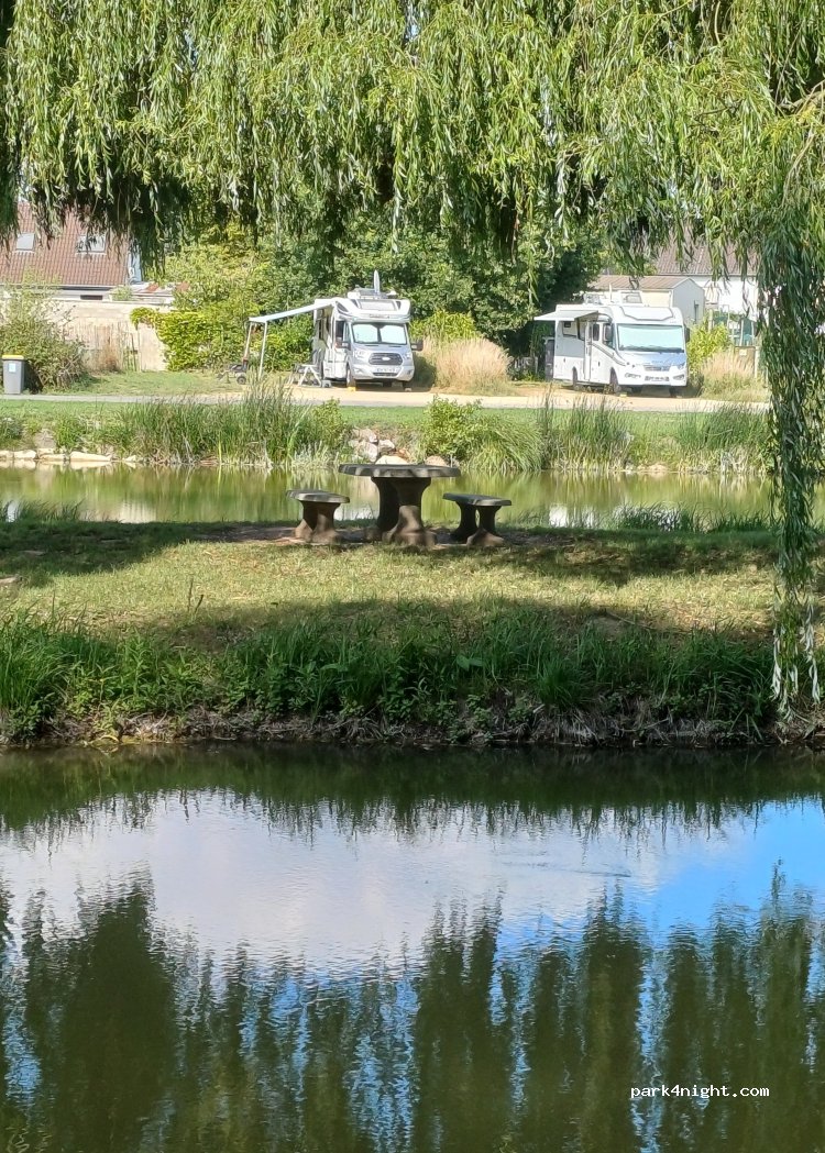 Beautiful spot overlooking the lake. Spent a peaceful Sunday evening eating a delicious takeaway Pizza from the local Italian restaurant a 10 min walk away. Very friendly staff. Great stop a couple of hours from Calais.
