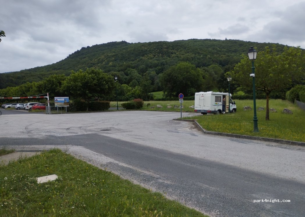 Situé en bordure du grand parking, bitume, à côté de l'emplacement des bus, calme, espace de pelouse devant, et un décor agréable. Services au minimum avec vidange eaux grises et Eaux noires dans la même trappe. Alimentation Eau propre par bouton à poussoir, un peu bas et sans filetage. L'ensemble est gratuit.
