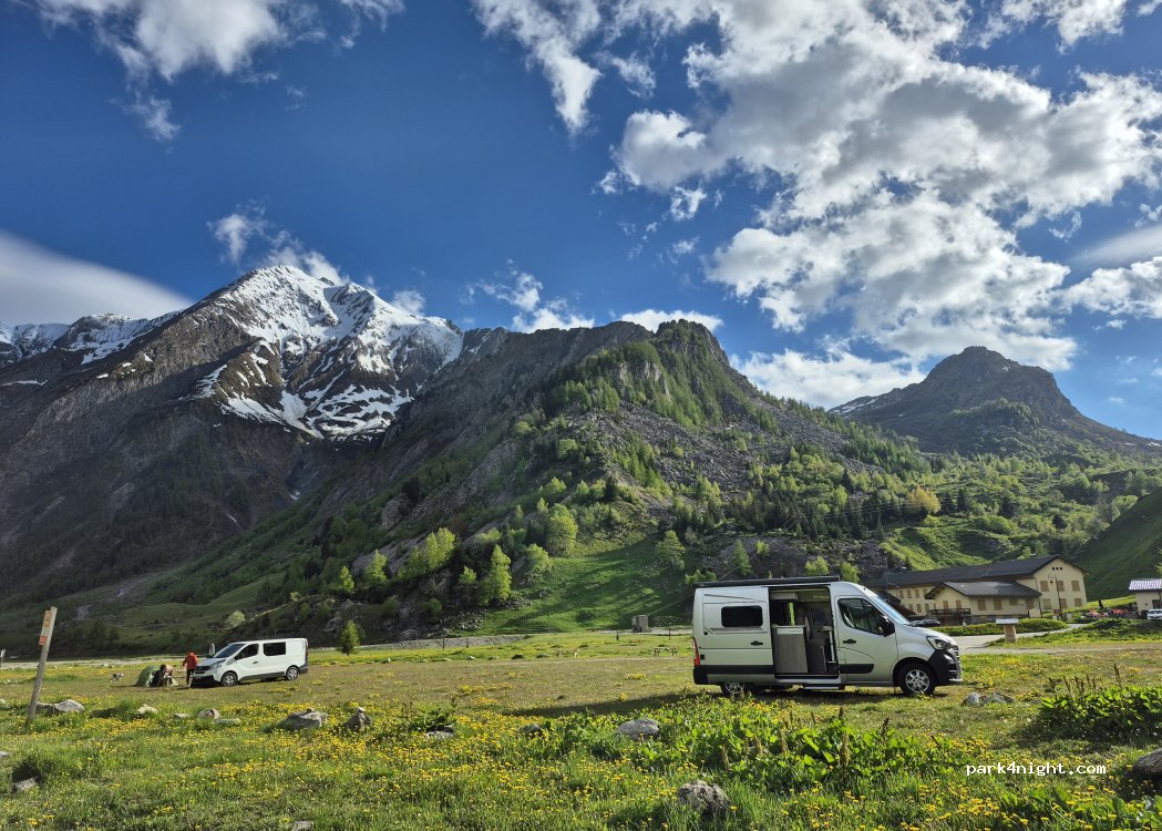 Super spot, loin des villes et du réseau téléphonique. nous étions peu nombreux. seul bémol : toilettes fermées mi juin, et des ouvriers qui jouent du tractopelle en plein milieu des vans à partir de 7h du mat... un autre spot à la Ville des Glaciers est top également.
