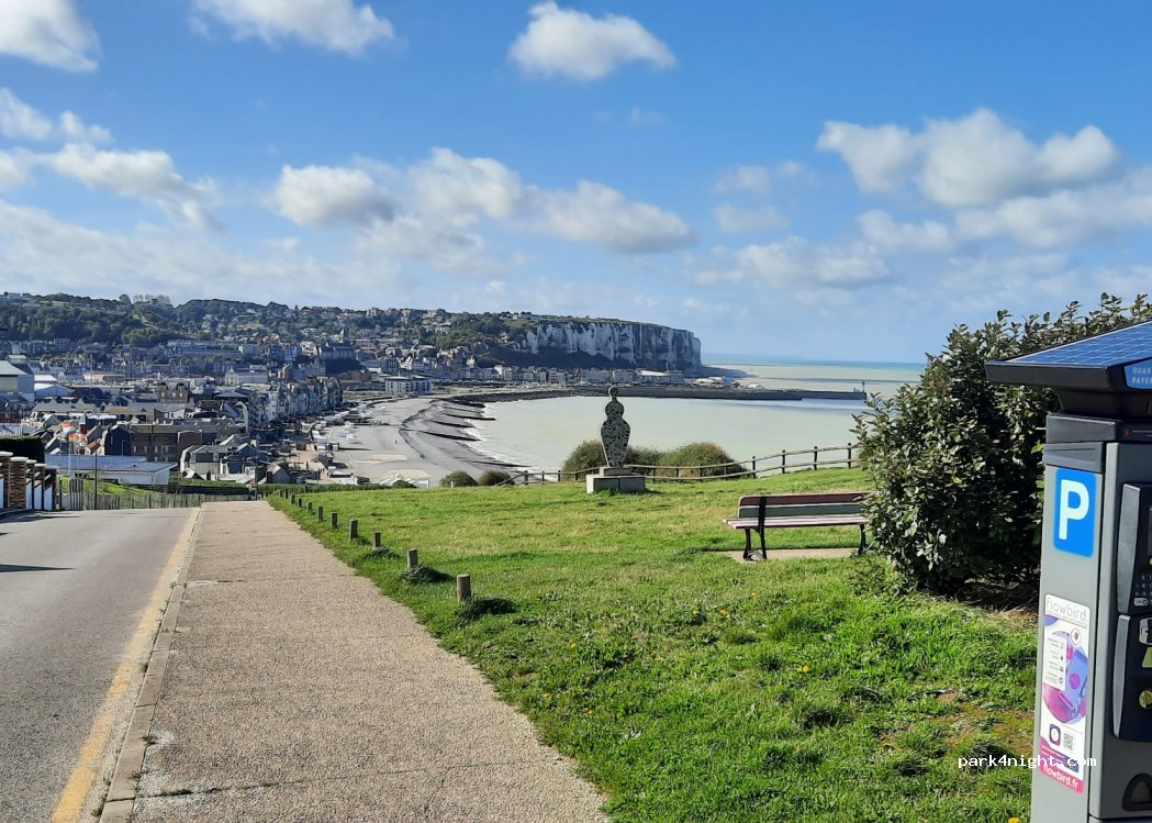 Day parking of the cliff (altitude 90 m). Camping forbidden. Near the Notre Dame des Flots statue and a panorama of the three sister cities (Mers, Tréport, Eu). No service. Mer les Bains is distinguished by its 600 ancient villas of the Belle Epoque.