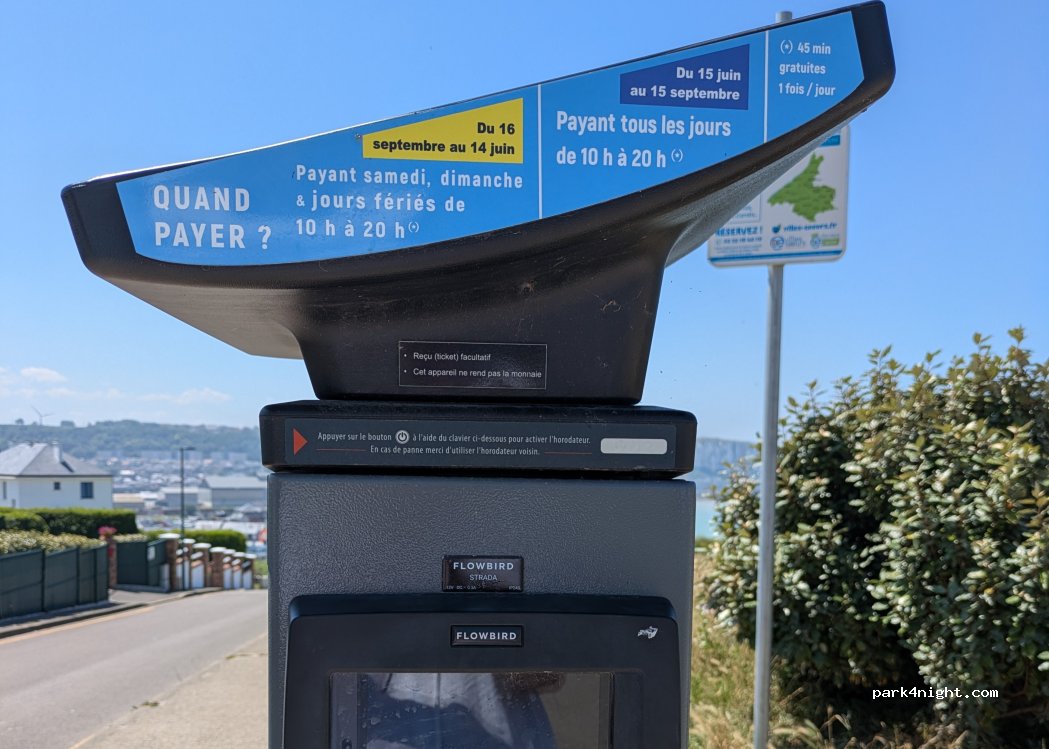 Aparcamiento diurno en acantilado (altitud 90 m). Prohibido acampar. Cerca de la estatua de Notre Dame des Flots y una vista de las tres ciudades hermanas (Seas, Le Tréport, Eu). Sin servicio. Mer les Bains se distingue por sus 600 antiguas villas de la Belle Epoque.