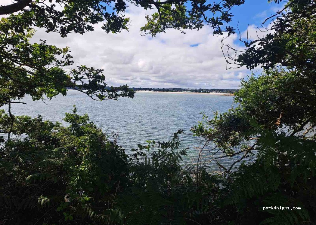 Grand parking ombragé, calme et agréable. avec des petites zones d'herbe et une forêt avec des chemins de randonnée. Nous avons pu profiter du coucher de soleil sur une petite plage à marée descendante. Quelques randonneurs en matinée et en fin de soirée.