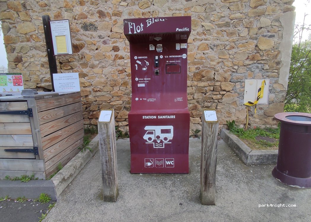 Borne à jetons euro relais. Seules sont possibles les vidanges grises et noire. Pas d’eau au robinet réservé au remplissage.