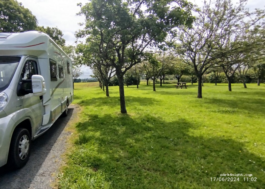 Parking agréable au milieu des pommiers, assez silencieux. Boîte de nuit et musique dans le lointain. Vidange des eaux grises impossibles, cassette eaux noires à vider dans les WC publics. Eau gratuite.
