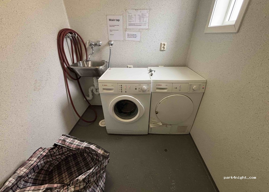 Great laundry room. Washer and dryer and there are also clean toilets and a shower. The toilets are free but for the shower and laundry you just go to the Balenstrand adventure shop opposite the marina (which is also tourist information) for the code and to pay 110NOK. The guy was very friendly. The laundry facilities are available 24-7. Highly recommend. There is plenty of parking available
